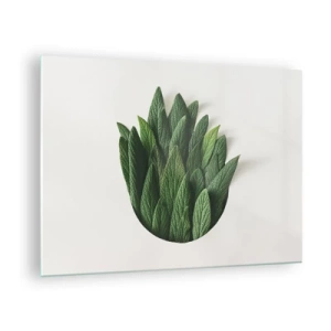Tablou pe sticlă - Frunze verzi aranjate în formă de vază pe fundal alb - 70x50cm - Curiozitatea nestăvilită - Decorațiune modernă pentru perete pentru living și dormitor ARTTOR