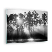 Tablou pe sticlă - Copaci alb-negru într-o pădure cu raze de soare în ceață - 70x50cm - Soare de neoprit - Decorațiune modernă pentru perete pentru living și dormitor ARTTOR