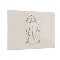 Tablou pe sticlă - O schiță delicată a unei femei așezate, desenată cu negru pe un fundal deschis la culoare. - 70x50cm - Nud de fată - Decorațiune modernă pentru perete pentru living și dormitor ARTTOR