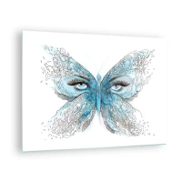 Tablou pe sticlă - Un fluture cu aripi albastre și ochi umani într-un stil artistic. - 70x50cm - Polyommatus eros - Decorațiune modernă pentru perete pentru living și dormitor ARTTOR