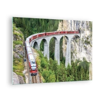 Tablou pe sticlă - Un tren cu un pod de munte în fundal printre peisaje verzi - 70x50cm - Cu trenul prin munți - Decorațiune modernă pentru perete pentru living și dormitor ARTTOR
