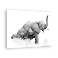 Tablou pe sticlă - Familie de elefanți alb-negri în natură - 70x50cm - Unu, doi, trei - Decorațiune modernă pentru perete pentru living și dormitor ARTTOR