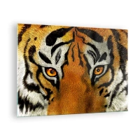 Tablou pe sticlă - Prim-plan al privirii intense a tigrului - 70x50cm - Amenințător și frumos - Decorațiune modernă pentru perete pentru living și dormitor ARTTOR