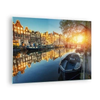 Tablou pe sticlă - Canalul din Amsterdam la apus - 70x50cm - Dimineața în Amsterdam - Decorațiune modernă pentru perete pentru living și dormitor ARTTOR