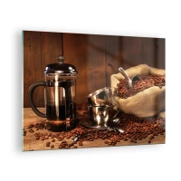 Tablou pe sticlă - Aparat de cafea, cești și un plic de boabe de cafea - 70x50cm - Magia cafelei - aromă și gust - Decorațiune modernă pentru perete pentru living și dormitor ARTTOR