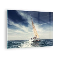 Tablou pe sticlă - Un iaht navighează pe o mare furtunoasă sub un cer albastru - 70x50cm - Nu ne vor prinde din urmă! - Decorațiune modernă pentru perete pentru living și dormitor ARTTOR
