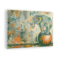 Tablou pe sticlă - Elefant abstract care se echilibrează pe o minge - 70x50cm - Trăiască circul! - Decorațiune modernă pentru perete pentru living și dormitor ARTTOR
