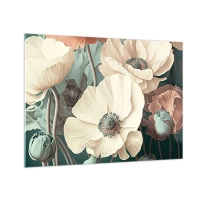 Tablou pe sticlă - Mac delicat cu cremă și somon pe un fundal închis - 70x50cm - Șoapta macilor - Decorațiune modernă pentru perete pentru living și dormitor ARTTOR