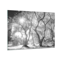 Tablou pe sticlă - Măslini albi și negri în lumina soarelui - 70x50cm - Într-o livadă de măslini - Decorațiune modernă pentru perete pentru living și dormitor ARTTOR