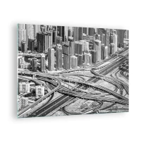 Tablou pe sticlă - Panoramă alb-negru a orașului cu o intersecție de autostradă - 70x50cm - Dubai - orașul imposibil - Decorațiune modernă pentru perete pentru living și dormitor ARTTOR