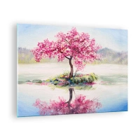 Tablou pe sticlă - Un copac roz pe o insulă reflectat în apa calmă - 70x50cm - Festivalul Primăverii - Decorațiune modernă pentru perete pentru living și dormitor ARTTOR