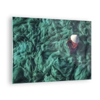 Tablou pe sticlă - femeie cu o pălărie tradițională care repară plase - 70x50cm - Într-o mare de rețea - Decorațiune modernă pentru perete pentru living și dormitor ARTTOR