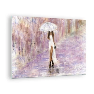 Tablou pe sticlă - Figura unei femei cu o umbrelă într-o scenă de ploaie liliac - 70x50cm - În ploaia de liliac - Decorațiune modernă pentru perete pentru living și dormitor ARTTOR
