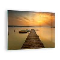 Tablou pe sticlă - Dig pe lac la apus cu o barcă - 70x50cm - Îți voi deschide cerul de aur - Decorațiune modernă pentru perete pentru living și dormitor ARTTOR