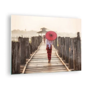 Tablou pe sticlă - O femeie cu o umbrelă roșie pe un pod de lemn - 70x50cm - Pe podul vechi - Decorațiune modernă pentru perete pentru living și dormitor ARTTOR