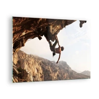 Tablou pe sticlă - Urcând pe o stâncă verticală într-un peisaj montan - 70x50cm - Lumea s-a micșorat într-un pumn pe un afloriment de bolovani - Decorațiune modernă pentru perete pentru living și dormitor ARTTOR
