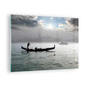 Tablou pe sticlă - Gondolă pe apele Veneției într-o dimineață cețoasă - 70x50cm - Un oraș fabulos de apă și ceață - Decorațiune modernă pentru perete pentru living și dormitor ARTTOR