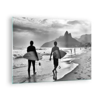 Tablou pe sticlă - Surferi pe plajă cu plăci, compoziție alb-negru - 70x50cm - Samba pentru un val - Decorațiune modernă pentru perete pentru living și dormitor ARTTOR