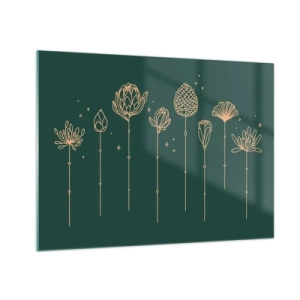 Tablou pe sticlă - Contururi aurii de ierburi și flori pe un fundal verde închis - 70x50cm - Familia IERBEscu - Decorațiune modernă pentru perete pentru living și dormitor ARTTOR