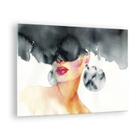 Tablou pe sticlă - Portretul unei femei cu cercei mari și o pată neagră deasupra capului - 70x50cm - Secretul eleganței - Decorațiune modernă pentru perete pentru living și dormitor ARTTOR