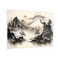 Tablou pe sticlă - Peisaj montan oriental cu pagodă și copaci - 70x50cm - Farmecul unic al Orientului - Decorațiune modernă pentru perete pentru living și dormitor ARTTOR