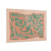 Tablou pe sticlă - Forme cu frunze verzi înconjurate de o ramă de coral pe un fundal bej - 70x50cm - Lupta dintre coral și verde - Decorațiune modernă pentru perete pentru living și dormitor ARTTOR