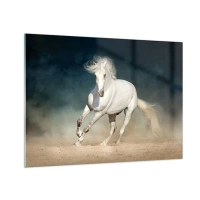Tablou pe sticlă - Un cal alb galopând pe nisip pe un cer întunecat. - 70x50cm - Libertate în stare pură - Decorațiune modernă pentru perete pentru living și dormitor ARTTOR