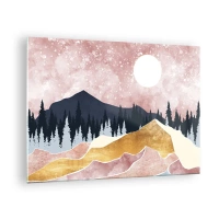 Tablou pe sticlă - Munți și pădure în lumina lunii pe un cer roz - 70x50cm - Garda de noapte - Decorațiune modernă pentru perete pentru living și dormitor ARTTOR