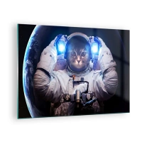 Tablou pe sticlă - Un cosmonaut cu cap de pisică în spațiu - 70x50cm - Houston, aveți o problemă - Decorațiune modernă pentru perete pentru living și dormitor ARTTOR