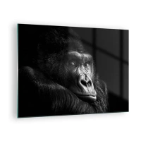 Tablou pe sticlă - Portret alb-negru al unei gorile la umbra unei ferestre - 70x50cm - Și la ce te uiți? - Decorațiune modernă pentru perete pentru living și dormitor ARTTOR