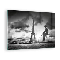 Tablou pe sticlă - Turnul Eiffel cu bicicletă retro în alb și negru - 70x50cm - Dorul de Belle Epoque - Decorațiune modernă pentru perete pentru living și dormitor ARTTOR