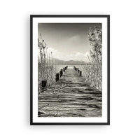 Poster în ramă neagră - Un pod de lemn printre stuf peste un lac în tonuri sepia - 50x70cm - În intimitatea ierburilor - Decorațiune modernă pentru perete pentru living și dormitor ARTTOR