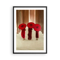 Poster în ramă neagră - Călugări cu umbrele roșii pe coridoarele templului - 50x70cm - Pe drumul spre Tărâmul Pur - Decorațiune modernă pentru perete pentru living și dormitor ARTTOR