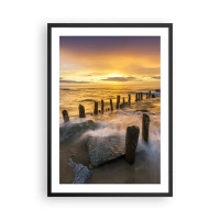Poster în ramă neagră - Apus de soare peste mare cu stâlpi de lemn pe plajă - 50x70cm - Frumusețe brută a mării - Decorațiune modernă pentru perete pentru living și dormitor ARTTOR