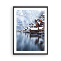 Poster în ramă neagră - Peisaj de iarnă al unui sat de munte lângă lac - 50x70cm - În decor de iarnă - Decorațiune modernă pentru perete pentru living și dormitor ARTTOR