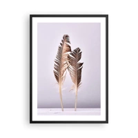 Poster în ramă neagră - Două pene maro pe un fundal deschis, într-un stil minimalist - 50x70cm - Împotriva neantului - Decorațiune modernă pentru perete pentru living și dormitor ARTTOR