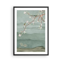 Poster în ramă neagră - Păsări pe o ramură înflorită cu vedere la dealuri - 50x70cm - Primăvara, ah, tu ești - Decorațiune modernă pentru perete pentru living și dormitor ARTTOR