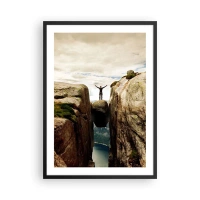 Poster în ramă neagră - Un bărbat stând pe o stâncă suspendată între stânci - 50x70cm - Cum mă simt!? - Decorațiune modernă pentru perete pentru living și dormitor ARTTOR