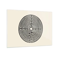 Tablou pe sticlă - Un labirint alb-negru, în formă circulară, pe un fundal deschis. - 70x50cm - Ordine secretă - Decorațiune modernă pentru perete pentru living și dormitor ARTTOR