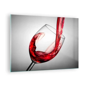 Tablou pe sticlă - Vin roșu turnat într-un pahar pe un fundal deschis la culoare - 70x50cm - Culoare - mișcare - sunet - Decorațiune modernă pentru perete pentru living și dormitor ARTTOR