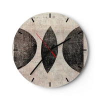 Ceas de perete - Ceas pe sticlă - Forme geometrice negre pe un fundal bej cu textură de in. - 30x30cm - Abstracție etnică - Decorațiune modernă pentru perete pentru living, bucătărie și dormitor ARTTOR