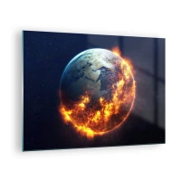 Tablou pe sticlă - Pământul înconjurat de flăcări în spațiul cosmic - 70x50cm - Flacăra apocalipsei - Decorațiune modernă pentru perete pentru living și dormitor ARTTOR