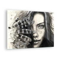 Tablou pe sticlă - Portret de femeie cu pene și detalii abstracte - 70x50cm - Frumusețe sălbatică - Decorațiune modernă pentru perete pentru living și dormitor ARTTOR