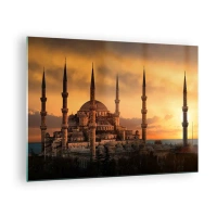 Tablou pe sticlă - Moscheea Albastră pe fundalul apusului de soare - 70x50cm - Dumnezeu este mare - Decorațiune modernă pentru perete pentru living și dormitor ARTTOR
