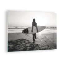 Tablou pe sticlă - Femeie cu o placă de surf pe plajă la răsărit - 70x50cm - Fiica valului mării - Decorațiune modernă pentru perete pentru living și dormitor ARTTOR