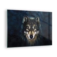 Tablou pe sticlă - Un lup pe un fundal întunecat de pădure, într-un stil realist. - 70x50cm - Alfa? Și omega - Decorațiune modernă pentru perete pentru living și dormitor ARTTOR