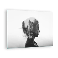 Tablou pe sticlă - O femeie în alb și negru cu un motiv de pădure de conifere suprapus - 70x50cm - Doamna din pădurea de pini - Decorațiune modernă pentru perete pentru living și dormitor ARTTOR