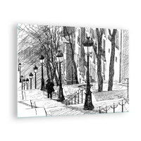 Tablou pe sticlă - Desen alb-negru al unei străzi de oraș cu felinare - 70x50cm - Poveste de dragoste sau poveste de groază? - Decorațiune modernă pentru perete pentru living și dormitor ARTTOR