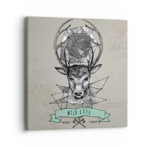 Tablou pe pânză Canvas - Geometrie de cerb în stil vintage cu inscripții Wild Life - 70x50cm - Viziunea Sfântului Hubertus - Decorațiune modernă pentru perete pentru living și dormitor ARTTOR