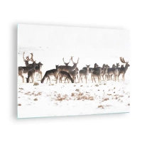 Tablou pe sticlă - O fotografie a unei turme de căprioare într-un peisaj înzăpezit - 70x50cm - Vine Crăciunul? - Decorațiune modernă pentru perete pentru living și dormitor ARTTOR